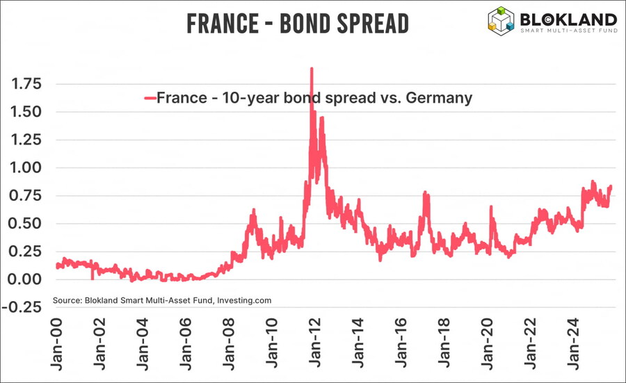 프랑스와 독일의 10년 만기 국채 금리 스프레드 (프랑스 국채의 위험 프리미엄)
