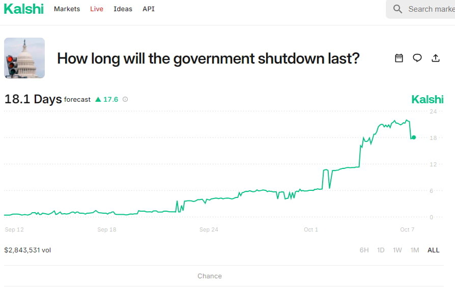 베팅 시장인 칼시에서는 셧다운 지속 기간에 대한 예측이 트럼프 대통령 발언 직후 21.6일에서 18.1일로 감소했습니다. 줄어들긴 했지만, 금세 해결될 것으로 보는 것은 아니죠.