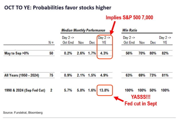 펀드스트랫의 톰 리 설립자는 셧다운이 지속하면 Fed는 비둘기파적 기조로 돌아설 수 있으며, 이는 증시에 긍정적이라고 주장합니다. 그는 새로운 고용 데이터가 없다면 "Fed는 부진했던 8월 고용보고서에 의존해야 할 가능성이 높다"라고 했습니다. 또 "경제가 셧다운과 활동 감소로 어려움을 겪고 있다"라는 점도 비둘기파적으로 고려할 것이라고 덧붙였습니다. 그는 "강력한 계절적 순풍이 불고 있으며, Fed가 비둘기파적이라는 점을 고려하면 상승세가 더 강하다"라고 썼습니다. 그는 4분기가 역사적으로 강세를 보인 시기였다고 분석했습니다. 1950년 이후 4분기 미국 증시는 4.9% 상승률(중간값)을 기록했고, 상승확률은 81%였다는 겁니다. 특히 올해처럼 Fed가 9월부터 금리를 인하했을 때가 두 차례(1998년, 2024년) 있었는데요. 이 두 해의 경우 4분기 평균 상승률은 13.8%였습니다.