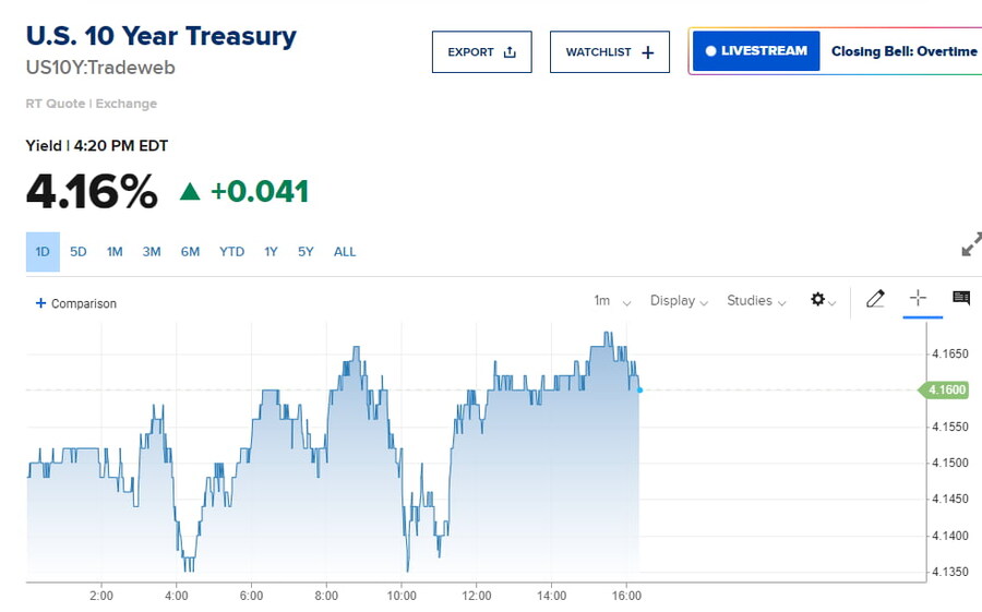 뉴욕 채권 시장에서 채권 금리는 상승세를 보였습니다. 오후 4시 20분 국채 10년물 수익률은 4.1bp 오른 4.16%를 기록했고요. 2년물은 2bp 상승한 3.592%를 기록했습니다. 미국 요인보다는 해외에서 국채 금리가 뛴 게 영향을 미쳤습니다.