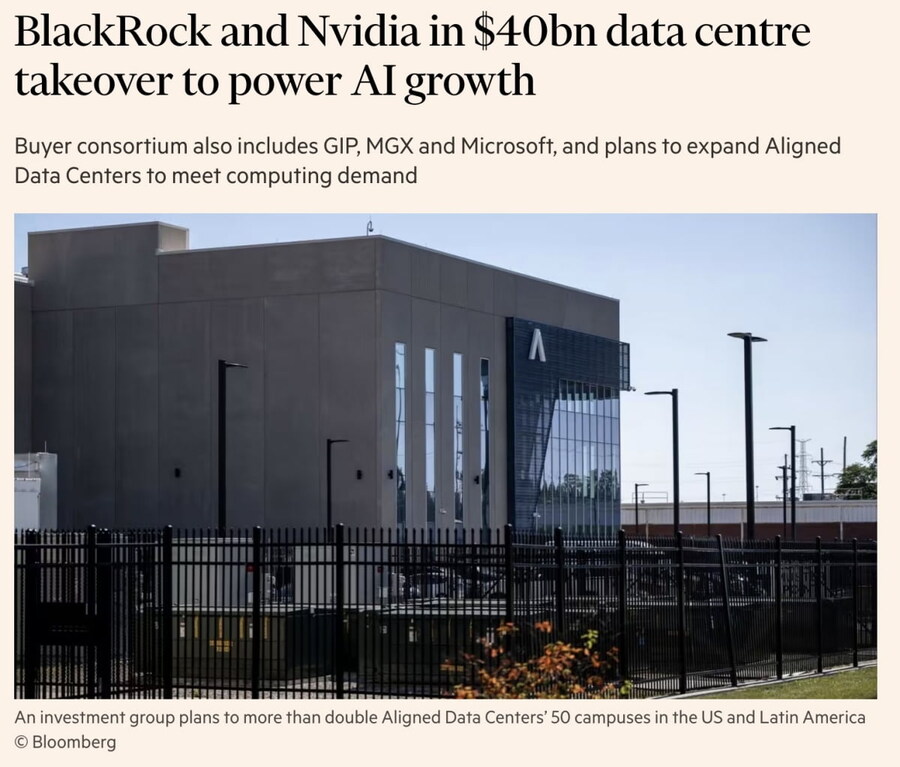 AI인프라파트너십(AIP)은 북미에서 데이터센터를 건설하고 운영하는 얼라인드데이터센터를 400억 달러에 인수한다고 밝혔습니다. AIP는 블랙록과 UAE의 MGX, 마이크로소프트, 엔비디아가 지난해 설립했으며 쿠웨이트투자청(KITA), xAI, 테마섹이 추가로 참여했습니다. AIP 대표인 래리 핑크 블랙록 CEO는 "이번 투자를 통해 AI의 미래를 구동하기 위해, 필요한 기반 시설을 공급한다는 우리 목표가 한층 진전됐다"라고 밝혔습니다.