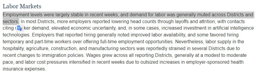 ◆인플레이션=물가는 더 상승했다. 여러 지역에서는 수입 비용 상승과 보험, 의료, 기술 솔루션 등 서비스 비용 상승으로 인해 투입 비용이 더 빠른 속도로 증가했다. 관세 영향은 여러 지구에서 보고되었지만, 최종 가격에 전가되는 정도는 달랐다. 일부 기업은 고객 반발로 판매 가격을 거의 변동 없이 유지했지만, 일부는 전가했다는 보고도 있었다.