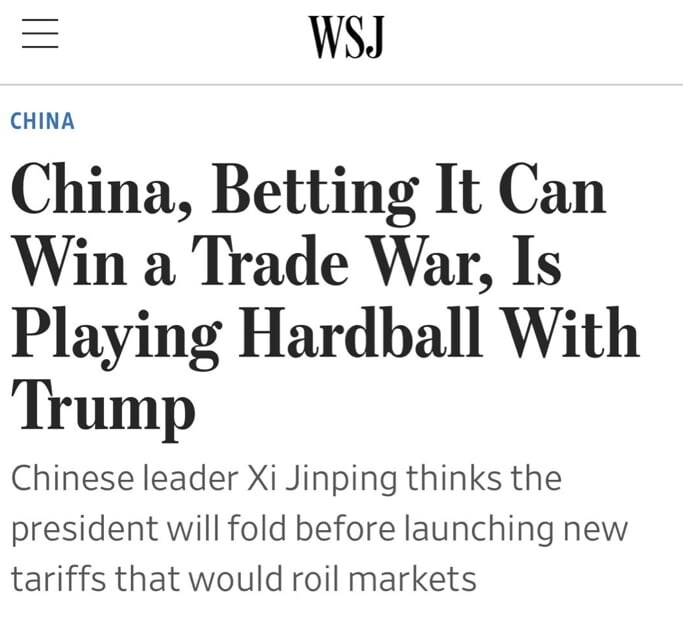 월스트리트저널(WSJ)은 중국이 강한 입장을 보이는 배경에 '트럼프 대통령이 결국 먼저 물러날 것'이라는 확신이 자리하고 있다고 보도했습니다. 미국 경제가 무역 분쟁 장기화를 감당하지 못할 것이고, 트럼프 대통령이 증시에 민감하다는 점을 '아킬레스건'으로 보고 있다는 겁니다.