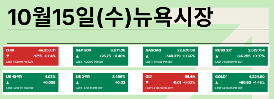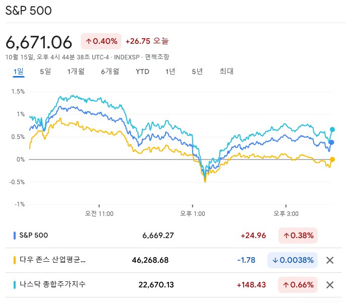 미·중 양국은 더 큰 협상력을 확보하기 위해 계속 치고받고 있습니다. 여기에 미국에선 정부 셧다운으로 경제 데이터 발표가 지연되고 있으니, 시장 불안은 당연한 일일지도 모릅니다. 하지만 경제 펀더멘털로 돌아가면 미국은 여전히 괜찮습니다. 은행 실적은 예상을 뛰어넘고 있고, 대출 손실도 여전히 적습니다. 보수적인 제이미 다이먼 JP모건 CEO도 관세로 인한 타격이 "모두가 예상한 것보다 적었다"라고 인정했죠. 다이먼이 지적한 한 가지 걱정거리는 고용 증가 둔화였습니다. 그건 미 중앙은행(Fed)의 개입으로 개선될 수 있습니다. 제롬 파월 의장은 고용 하방 위험에 대응하기 위해 계속 금리를 내릴 가능성을 시사했죠. 또 향후 몇 달 안에 양적긴축(QT)을 중단할 수도 있다고 했습니다. 15일 뉴욕 증시는 오르락내리락했지만, 상승세로 마감했습니다.