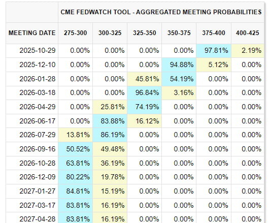 시카고상품거래소(CME) Fed워치 시장에서의 10월 인하 베팅은 97.8%에 달하고 있습니다. 1주일 전 94.1%보다 높은 것이고요. 12월 인하에도 94.9%가 베팅하고 있습니다.