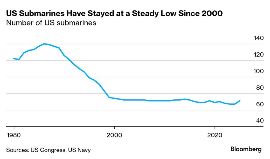 블룸버그 인텔리전스(Bloomberg Intelligence)의 추정에 따르면, 미국 잠수함은 수적으로나 기술적으로 여전히 경쟁국보다 우수하며, 역량 면에서 5년에서 10년의 우위를 점하고 있습니다.