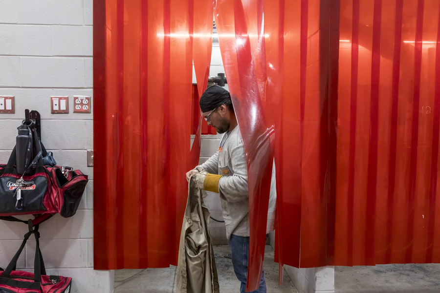 용접 부스에 들어가기 전 보호 장비를 착용하는 훈련생. 사진: 레이첼 제슨/블룸버그
