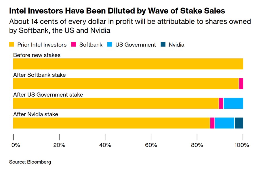 인텔의 사례를 보십시오. 적자를 면치 못하던 이 반도체 제조업체는 미국 정부, 소프트뱅크 그룹, 그리고 엔비디아에 180억 달러 규모의 지분을 매각하기 시작한 8월 초 이래로 주가가 거의 90%나 치솟았습니다. 이 거래들은 신규 자본을 유치하여 인텔의 대차대조표를 강화하기 위해 설계되었습니다.