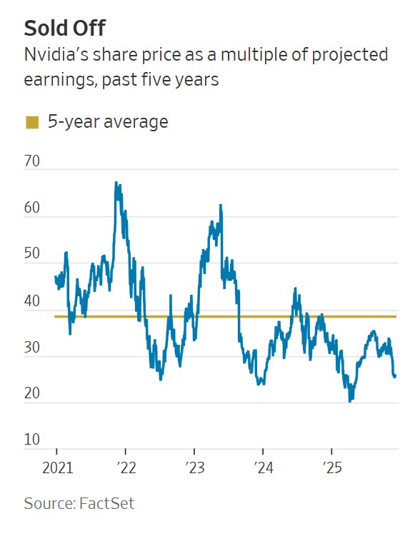 최근의 주가 하락으로 세계에서 가장 시가 총액이 높은 기업인 엔비디아의 주가가 저렴해 보이기 시작했습니다. 팩트셋(FactSet) 데이터에 따르면, 엔비디아 주식은 현재 향후 4분기 예상 이익(projected earnings) 대비 약 26배에 거래되고 있습니다. 이는 지난 5년 중 가장 낮은 수준에 가깝습니다. 하지만 이 비율은 향후 1년 동안의 예상 이익을 기반으로 산출된 것입니다. 만약 강력한 경쟁으로 인해 엔비디아가 가격을 인하해야 한다면, 이 예상 이익 수치는 하방 압력을 받을 수 있습니다.