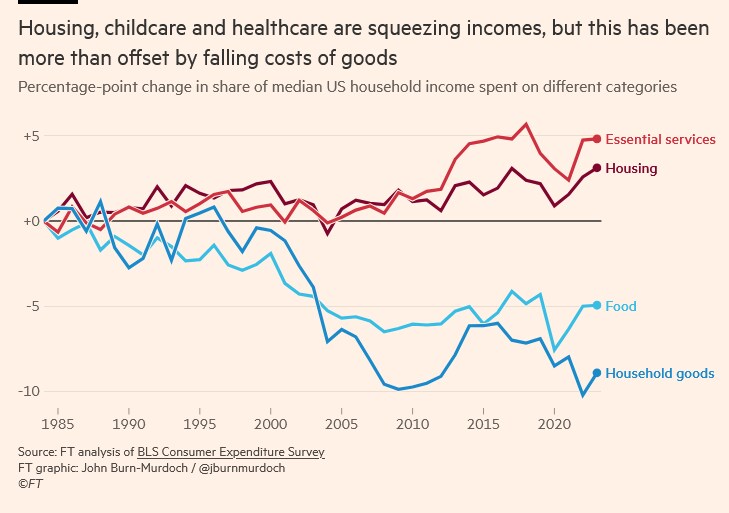 그린과 그의 지지자들이 올바르게 짚은 부분은 중산층 소득에서 필수 항목 지출이 차지하는 비중입니다. 이는 장단기적으로 모두 크게 증가했습니다. 의료비(최근 수십 년간 소득 대비 비중 3%포인트 상승), 보육비(2%포인트 상승), 주거비(4%포인트 상승), 식품비(최근 몇 년간 1%포인트 상승) 등 소득에서 차지하는 비중 증가분을 모두 합하면, 이러한 필수 비용에 대한 총지출은 중산층 가처분 소득의 3분의 1 수준에서 전체의 절반 수준으로 상승했습니다.