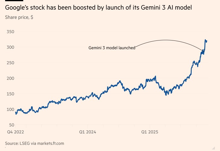 내용: 구글의 주가는 2024년 초반부터 꾸준히 상승하다가, '제미나이 3 모델 출시(Gemini 3 model launched)' 시점을 기점으로 급격한 상승 곡선을 그리며 300달러 선을 돌파했습니다.