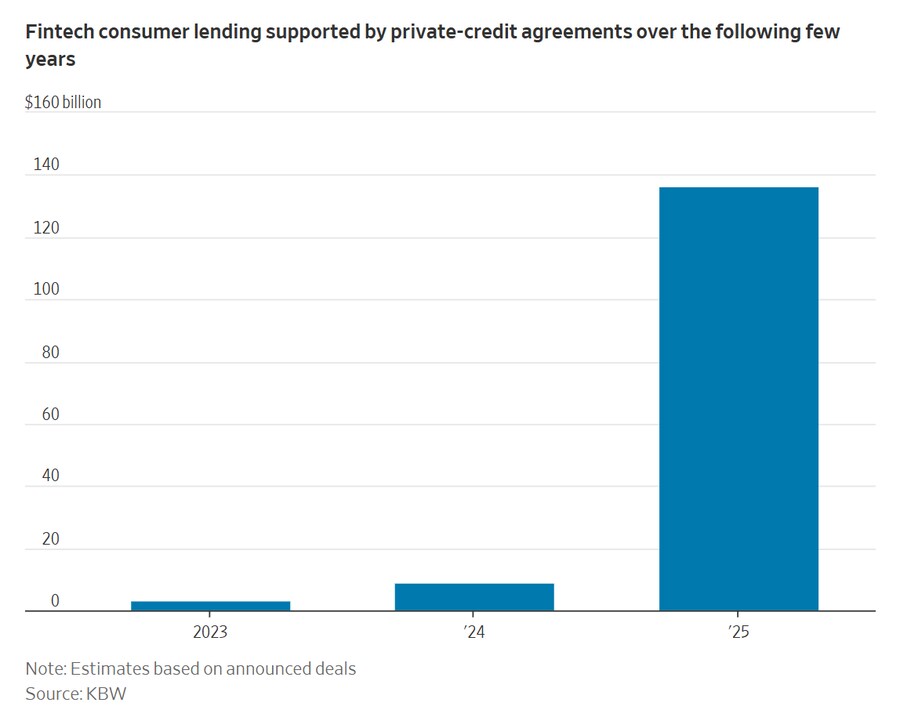 사모 신용(Private credit)이 이른바 '대안적 소비자 대출' 시장에서 폭발적으로 성장하고 있습니다. KBW의 애널리스트들은 올해 소비자 대출 분야의 핀테크 기업들을 위한 신규 사모 신용 자금 조달 거래를 집계했습니다. 그 결과, 향후 몇 년간 전 세계적으로 약 1,400억 달러 규모의 대출을 지원할 수 있을 것으로 추산되었습니다. 이는 2024년 100억 달러 미만이었던 것과 비교하면 엄청난 급증세입니다.