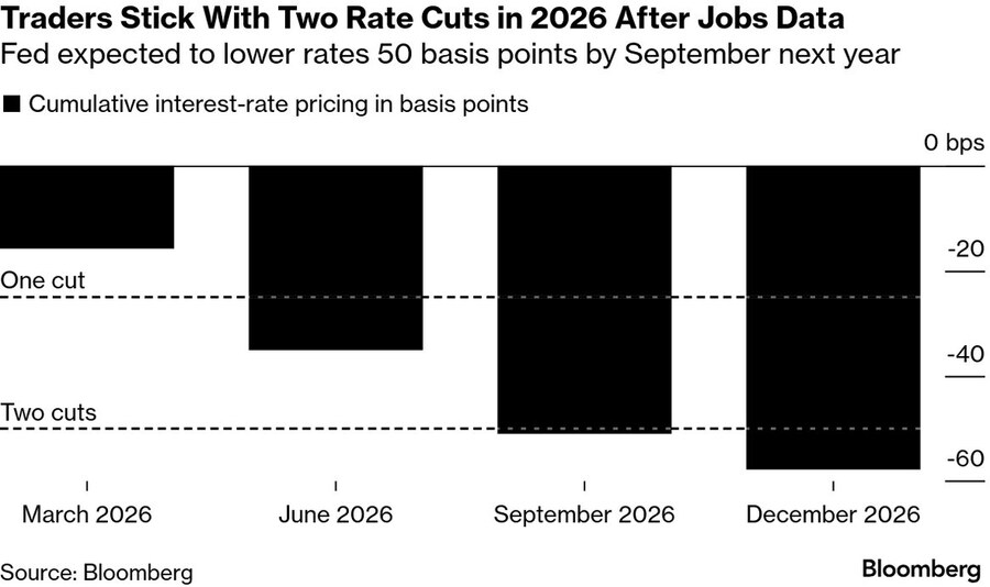 • 그래프 제목: 고용 데이터 발표 후 트레이더들은 2026년 두 차례 금리 인하 전망 유지