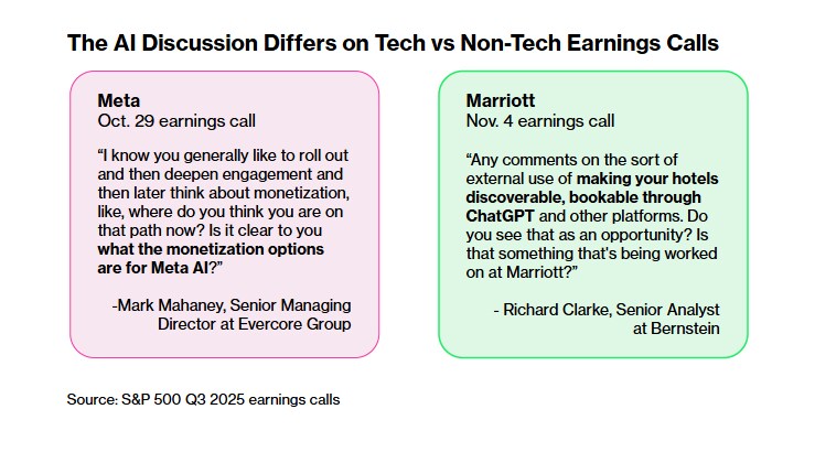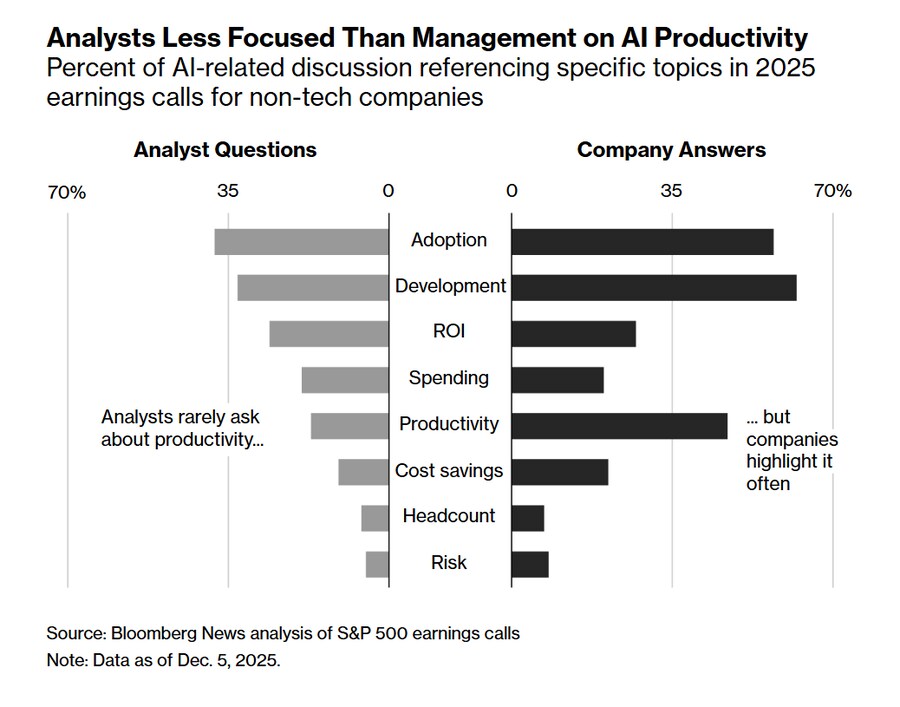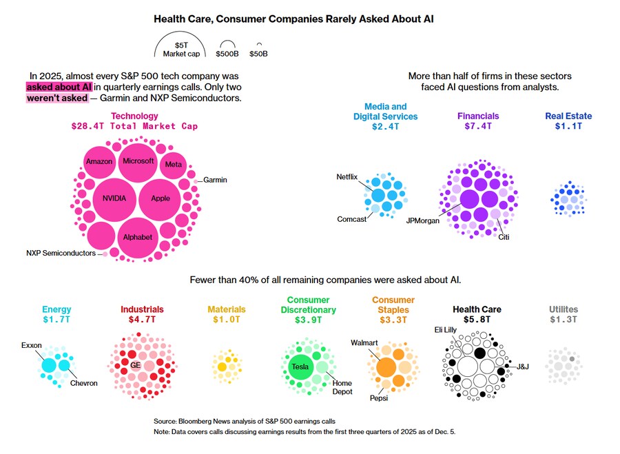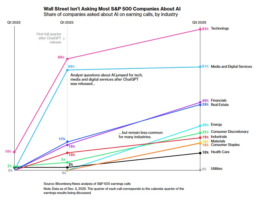 블룸버그 뉴스가 실적 발표 녹취록을 분석한 결과, 2025년 S&P 500 지수 포함 기업 중 분석가들로부터 '생성형 AI'에 관한 질문을 받은 기업은 절반에도 미치지 못했습니다.