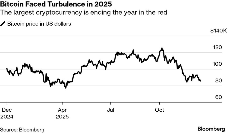 차트 설명: 2024년 12월부터 2025년 말까지의 비트코인 가격 추이. 2025년 초반 상승세를 보이다 4월경 하락, 이후 10월경 12만 달러를 넘는 최고점을 찍었으나 연말로 갈수록 급격히 하락하여 8만 달러 수준에서 마감하는 모습을 보여줌. 전반적으로 큰 변동성을 나타냄.