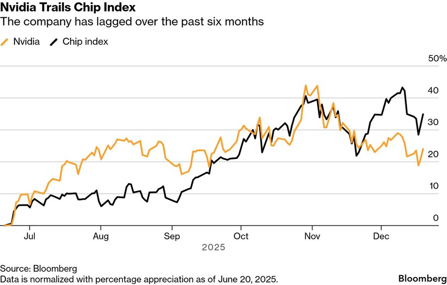 (차트 분석) 2025년 7월부터 12월까지의 주가 흐름을 보면, 엔비디아(주황색)는 10월경까지 반도체 지수와 유사한 흐름을 보였으나, 11월 이후 반도체 지수(검은색)가 약 40% 가까이 상승하는 동안 상대적으로 낮은 상승 폭을 보이며 지수를 하회하고 있습니다. 자료: 블룸버그 (데이터는 2025년 6월 20일 기준 주가 상승률로 정규화됨)