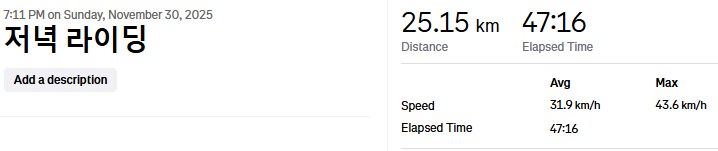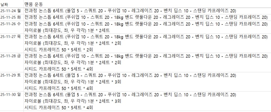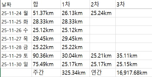 [★멸치 홈트레이닝★] 이번 주 운동 완 325.34km + 맨몸 운동2025.11.30 PM 09:24