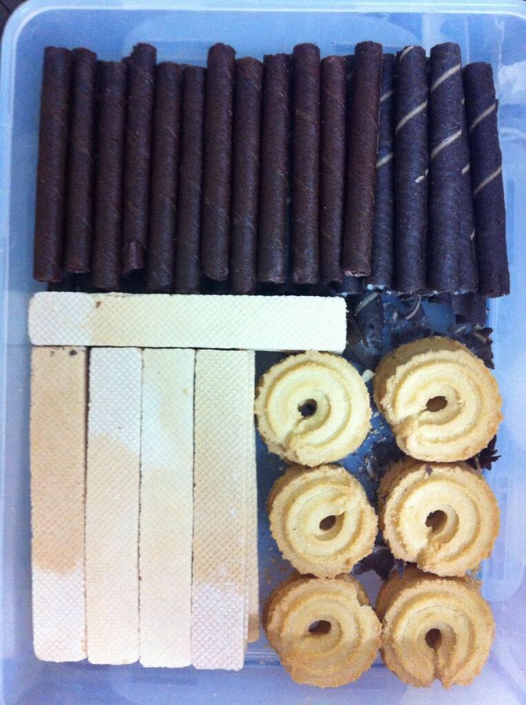 수입과자 4000원어치, 버터링 모양 12개, 대형 웨하스 15개, 막대과자 44개.