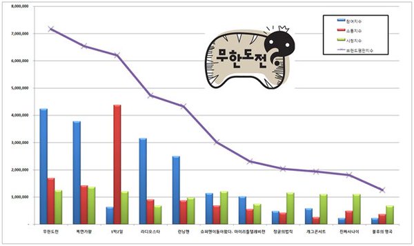 예능 프로그램 4월 브랜드 조사에서 무한도전이 1위를 차지하였습니다.