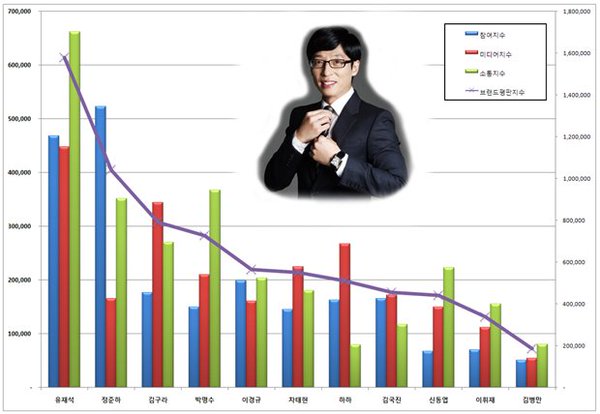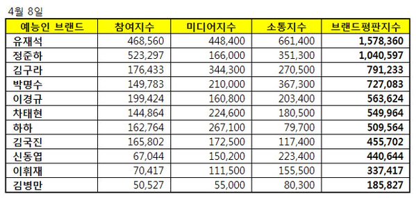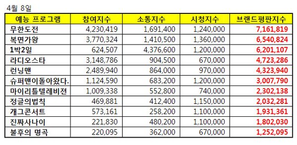 예능 방송인 4월 브랜드조사에서 유느님이 1위, 준하씨가 2위, 명수옹이 4위, 하하씨가 7위를 차지하였습니다.